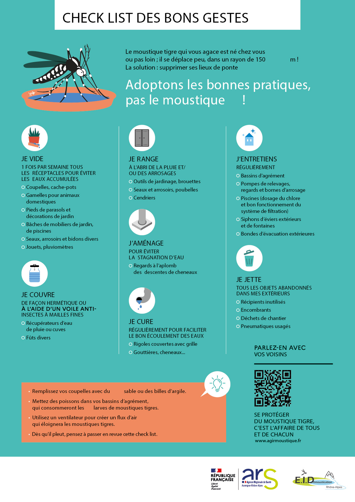 Quelques gestes simples et essentiels à mettre en œuvre chez vous d’avril à octobre. Prenez quelques minutes chaque semaine pour empêcher que le moustique tigre ne vous envahisse :